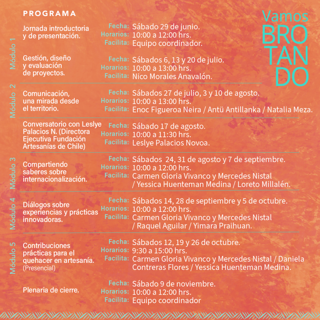 5 módulos con 18 sesiones de temáticas específicas donde se conocerán y abordarán las diversas áreas para potenciar proyectos iniciales y emergentes en las disciplinas de textil, cerámica y orfebrería.