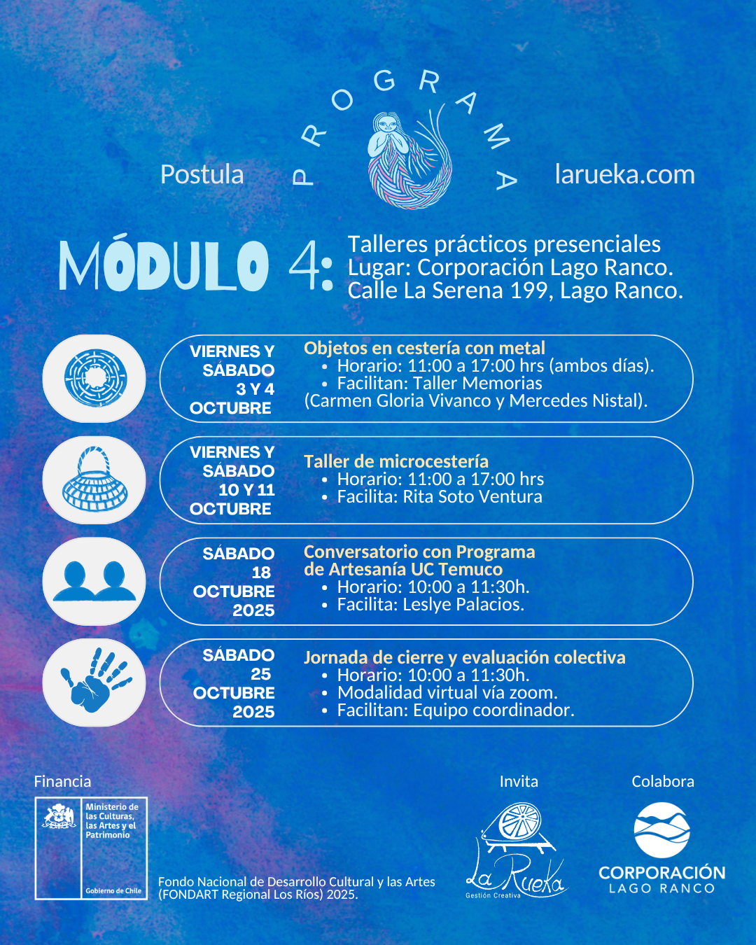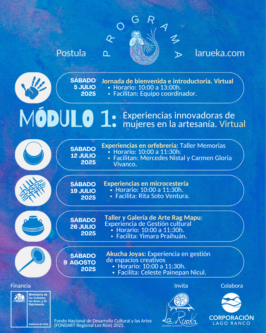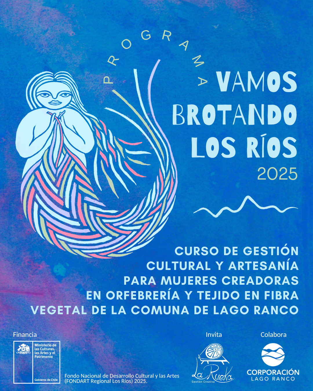 Tienes una idea o un proyecto relacionado a la artesanía en orfebrería o tejido en fibra vegetal? Postula! Dirigido a 20 mujeres de la comuna de Lago Ranco. 15 jornadas virtuales y 2 presenciales entre julio y octubre. Proyecto financiado por el Fondo Nacional de Desarrollo Cultural y las Artes (FONDART Regional Los Ríos) 2025 del Ministerio de las Culturas, las Artes y el Patrimonio