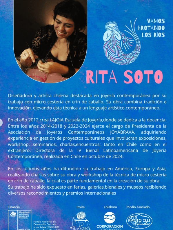 En el marco del programa formativo Vamos Brotando Lago Ranco, se realizó la sesión “Experiencias en microcestería”, guiada por la destacada diseñadora industrial, artista y referente internacional de la joyería contemporánea Rita Soto Ventura, quien compartió con las participantes un recorrido amplio por su proceso creativo, sus series emblemáticas y su trabajo con microcestería en crin de caballo. La iniciativa es financiada por el Fondo Nacional de Desarrollo Cultural y las Artes (FONDART Regional Los Ríos) 2025, del Ministerio de las Culturas, las Artes y el Patrimonio.